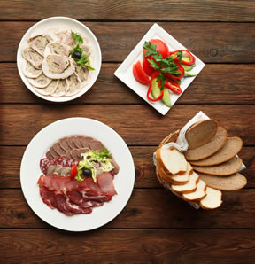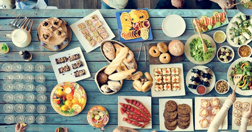 alimentos, bebidas, cubiertos, manteles y mesas.